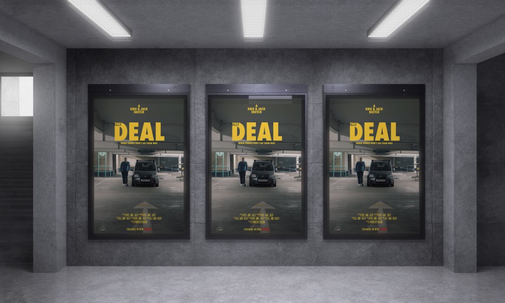 My favourite style of posters are ones that foreshadow a bit or bits of what happens in the film. I chose a single still that happens almost at the beginning of the film to show what is happening while keeping you wondering what the significance of the car is and why he’s walking the way he is. There’s something special about short films, and “THE DEAL” has a charm that will keep you interested for its 8:14 length timeFor deliverables, I’ve included a square poster to fit the feed of social media, then a 3300×5100 which translates to 11×17 inch for more of a traditional poster size. Since it’s featured on YouTube, I’ve also included a thumbnail design to make it look more professional, which can also be used for a billboard design.